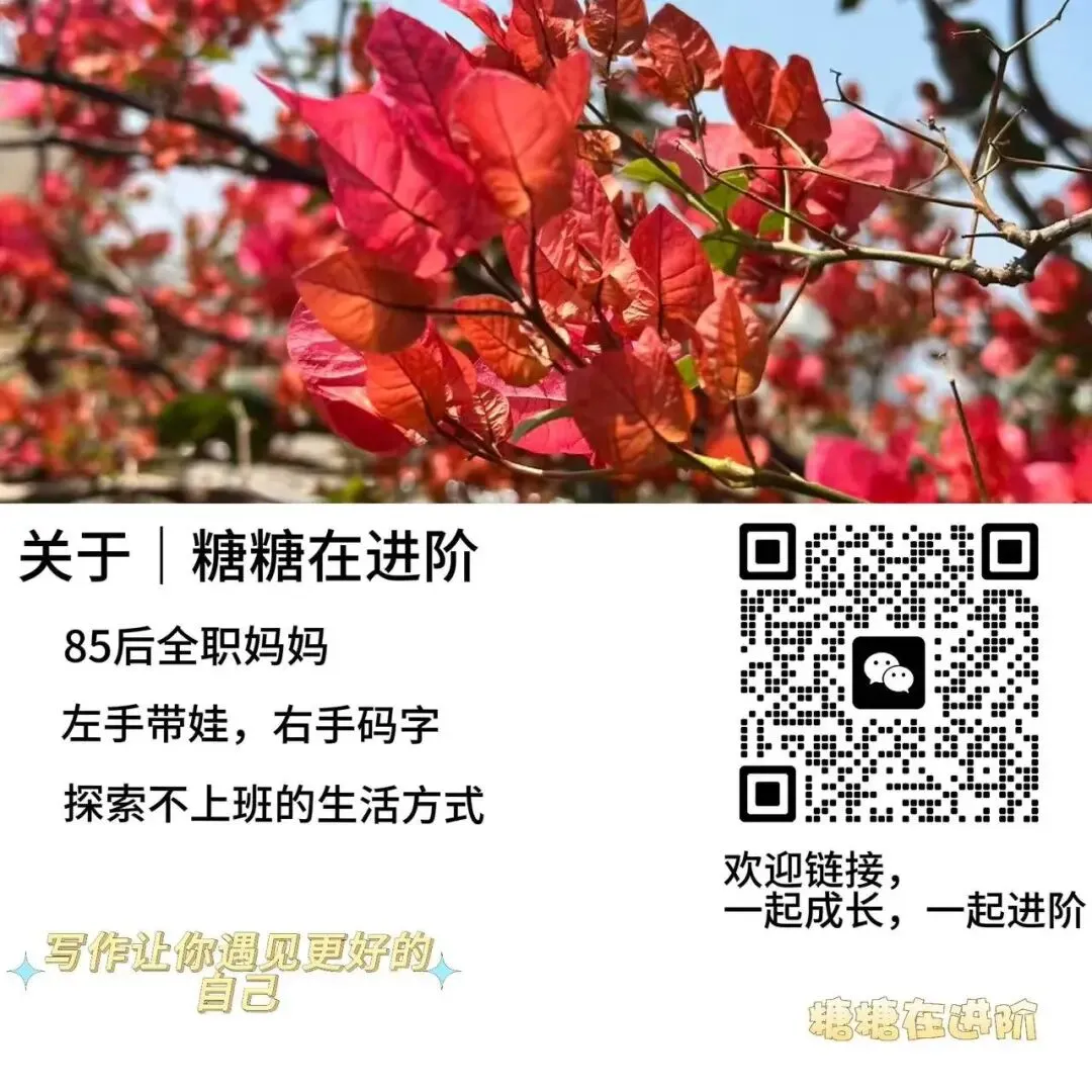 糖糖,85后,专注分享个人成长,中年感悟,手执烟火以谋生,心怀诗意以谋爱。