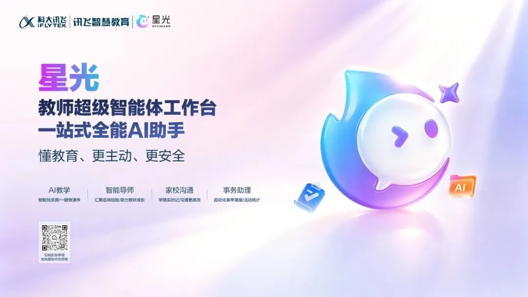 在科大讯飞展台前,他看到大屏幕上正在发布一款新产品:教师超级智能体“星光”。展台工作人员告诉他:“这是专为老师打造的一站式智能工作台,备课、教研、学情、家校、事务管理……都能帮上忙。”