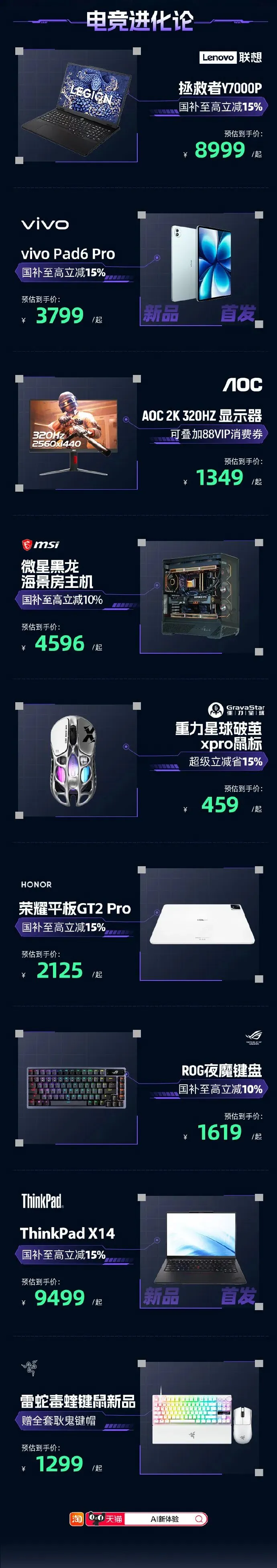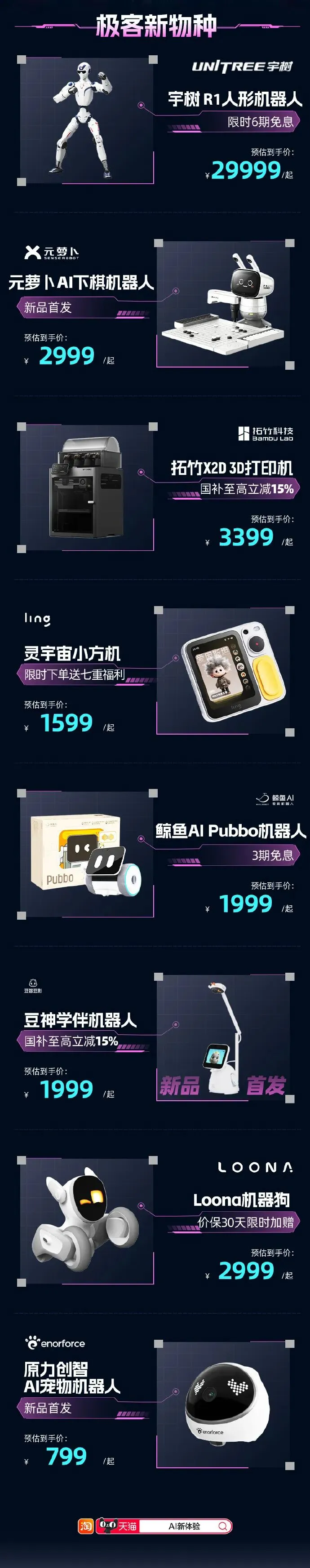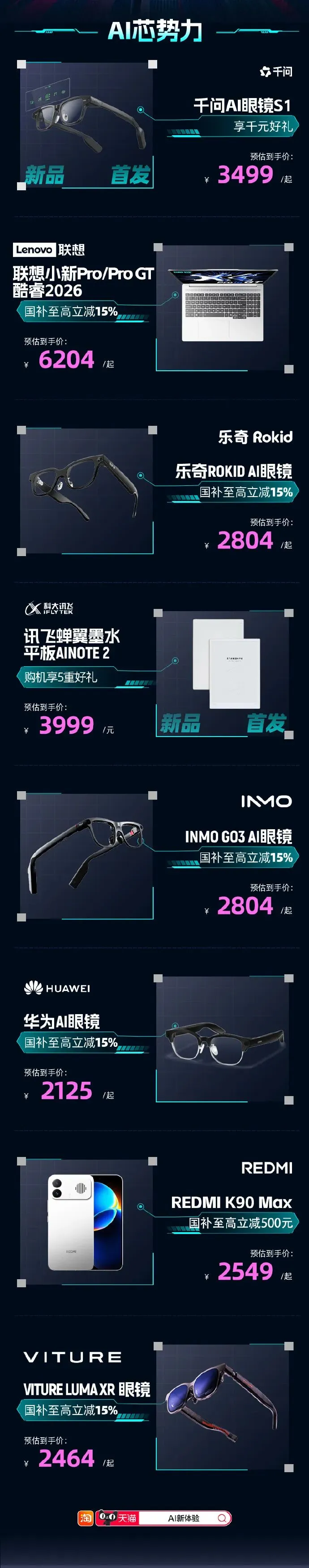 作为AI品牌第一经营阵地与AI新品首发第一阵地,据悉天猫在2026年618期间,将有千款AI新品在天猫首发,叠加国家补贴及平台优惠,消费者可享低至5折的专属福利。