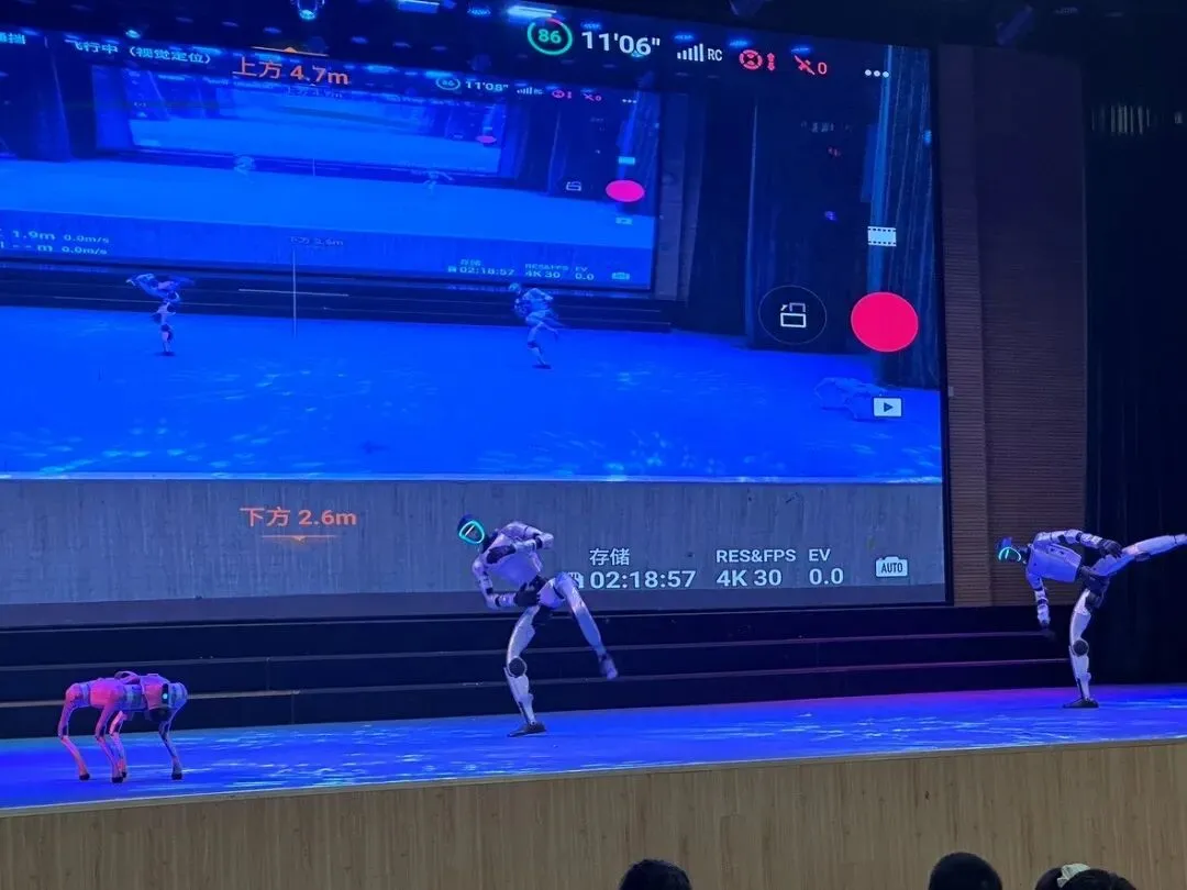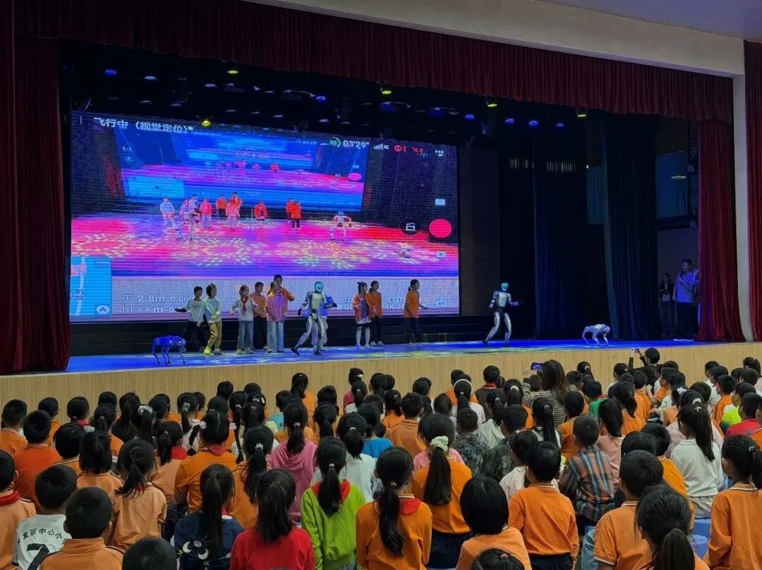 紧接着,精彩绝伦的科技特色表演惊艳登场。灵动的无人机编队腾空而起,在空中灵活盘旋、勾勒出灵动十足的画面;智能机器狗轮番亮相,精准完成行走、转身、律动等一系列动作,灵活又富有趣味;各式机器人整齐展演,动作连贯流畅,尽显科技智慧。炫酷十足的表演极具视觉冲击力,牢牢吸引了全场师生的目光,现场掌声连连、喝彩不断。近距离的科创实景展示,让同学们直观感受到人工智能与前沿科技的独特魅力,深切体会到科技的神奇与力量,进一步点燃了大家探索科学、勇于创新的热情,将开幕式气氛推向高潮。