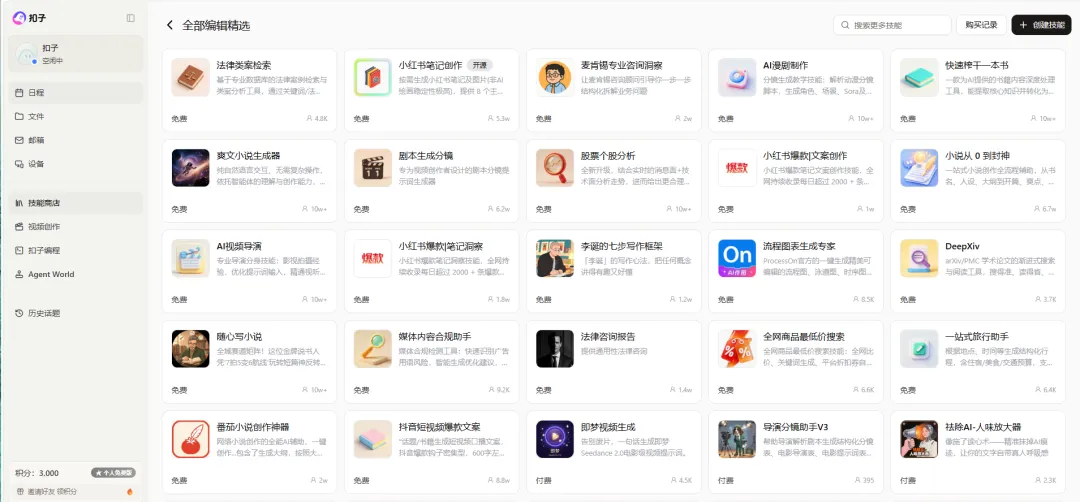 在扣子的“技能商店”里,有海量别人制作好的技能,找到喜欢的,一键安装即可使用。