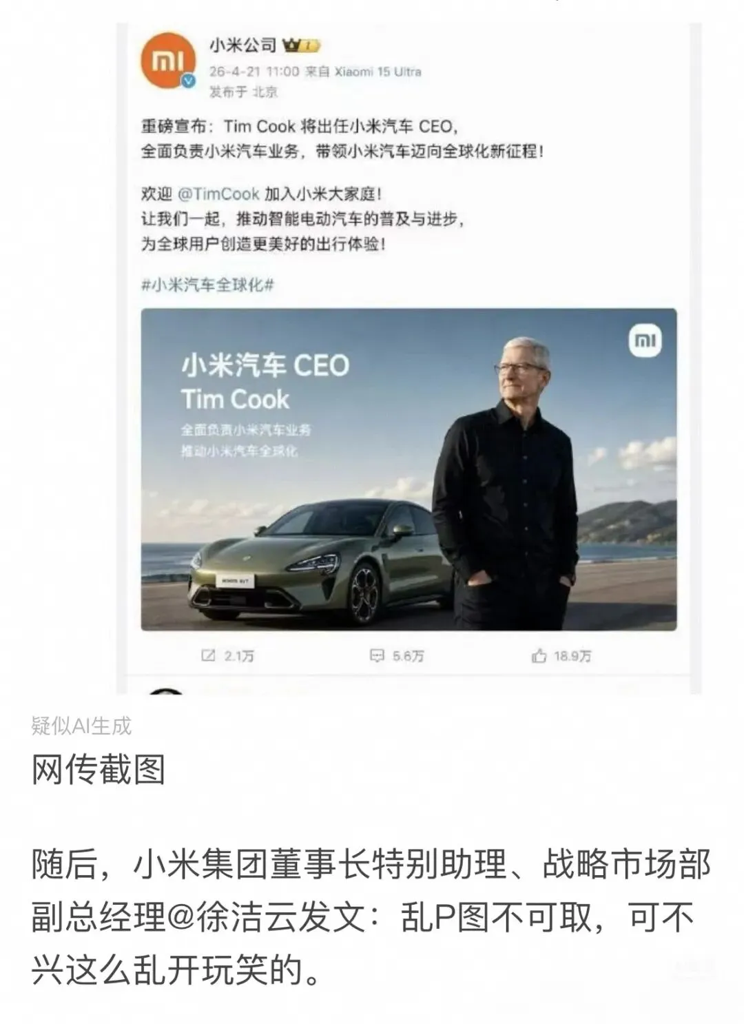 2026年4月,一张“小米汽车官宣蒂姆库克出任CEO”的图片在网络疯传并冲上热搜,直至小米高管紧急辟谣,公众才发觉这是GPT-Image2生成的AI伪造图片。随着大模型公司推出的AI生图技术实现突破性发展,伪造银行转账截图、虚假新闻配图、恶意商业诋毁图片等案例已从技术可能性变为现实威胁。