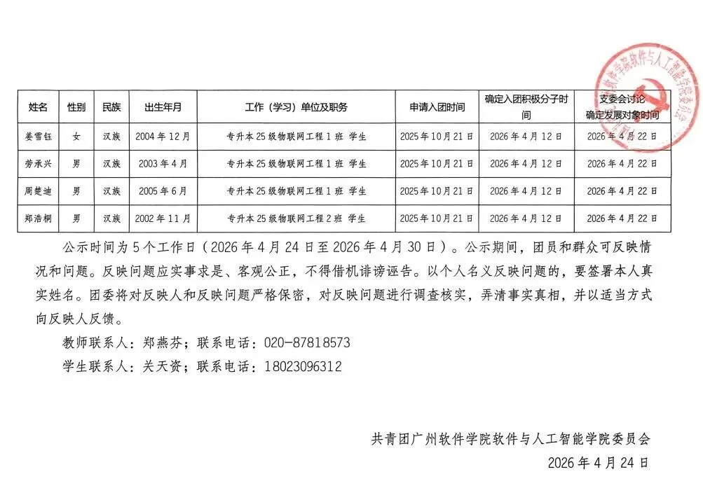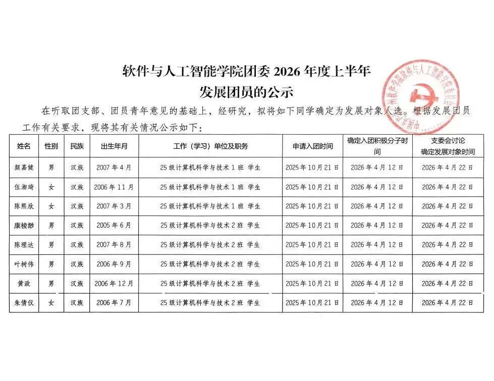 【公示】软件与人工智能学院团委2026年度上半年发展团员的公示