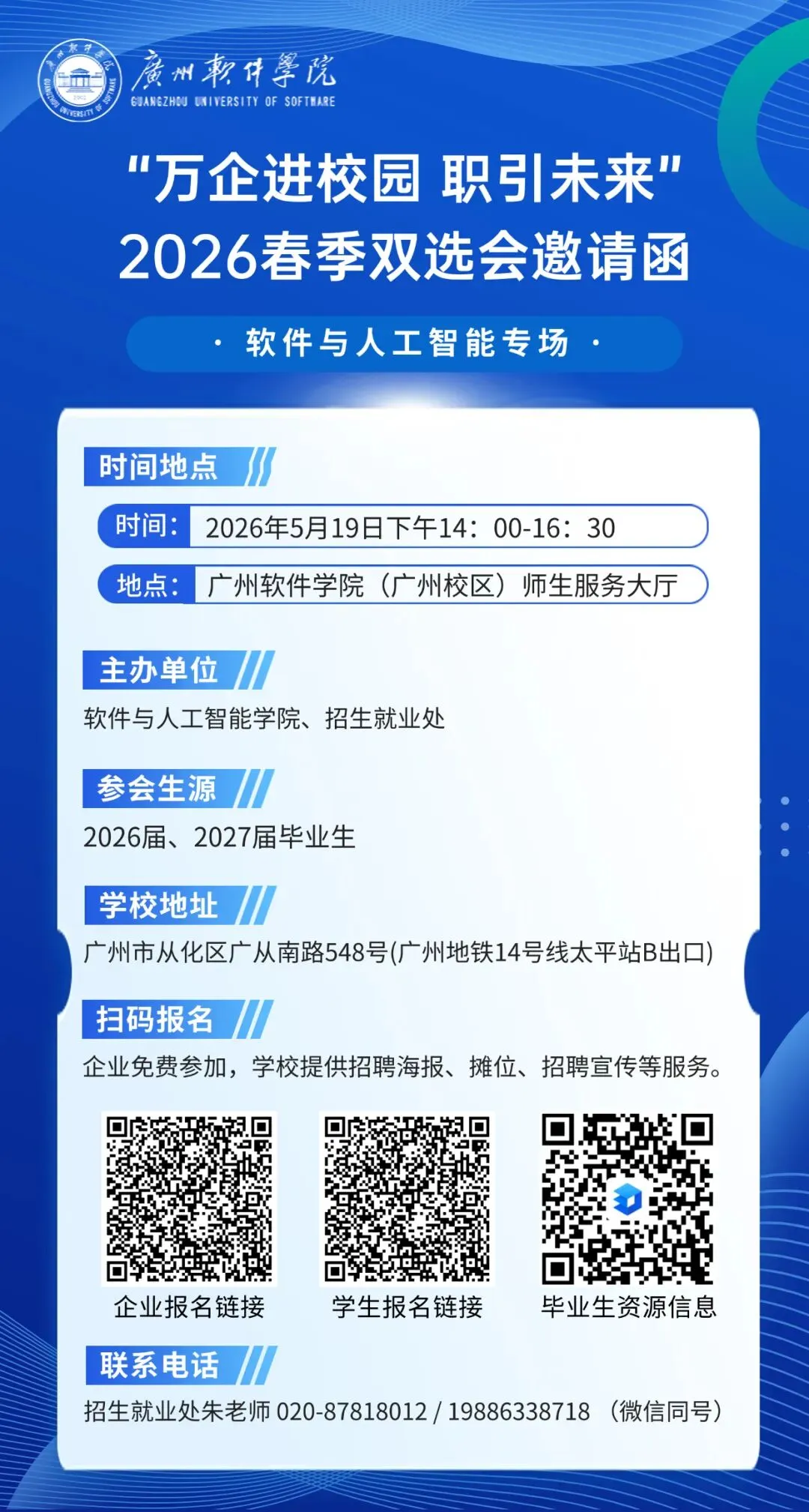 为深入贯彻落实党中央、国务院关于高校毕业生就业工作的决策部署,进一步搭建高校与企业精准对接平台,促进人才供需高效匹配,全力推动我校毕业生高质量充分就业,现定于2026年5月19日举办广州软件学院“万企进校园”活动——“码动未来·智就湾区”软件与人工智能人才双选会。