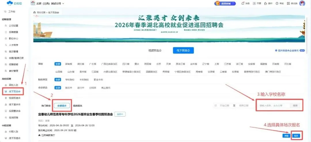 (二)用人单位注册并登录云校招平台后→后台点击“招聘面试”→点击“校园招聘”→点击“线下双选会”→搜索“广州软件学院”→选择【5月19日“万企进校园”活动——“码动未来·智就湾区”软件与人工智能人才双选会】场次点击“报名”→填写职位等信息→提交等待审核。