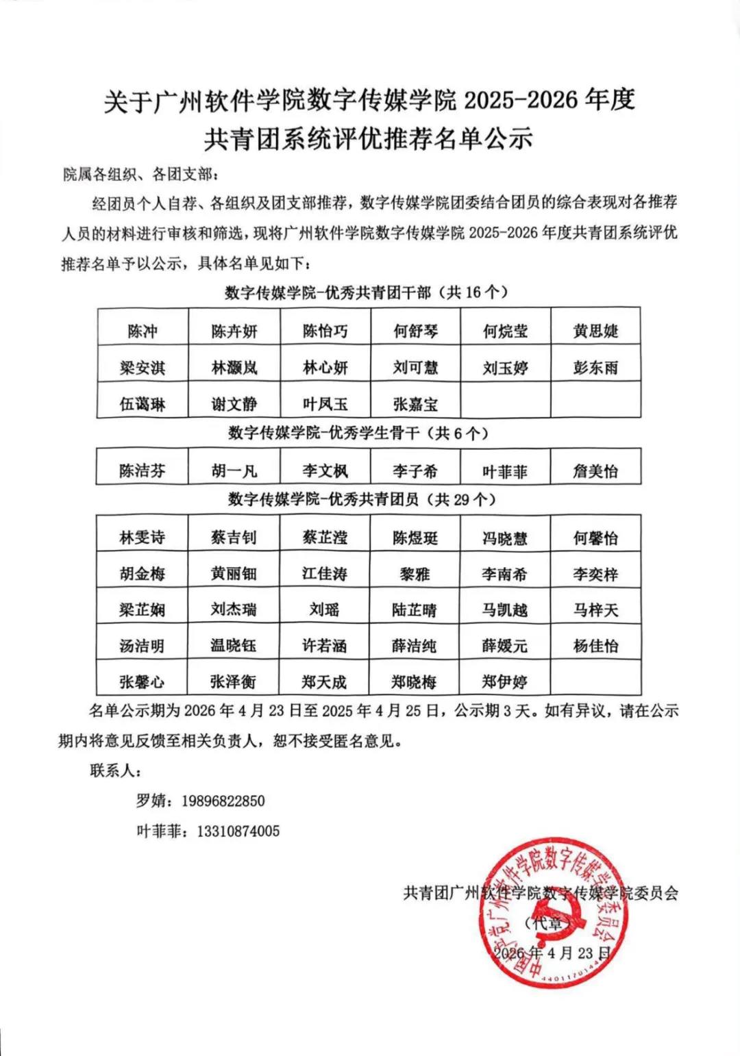 广州软件学院数字传媒学院2025-2026年度共青团系统评优推荐名单公示 编辑 | 新媒体工作部 周亚亨 校对 | 数字传媒学院团委学生副书记 罗婧 初审 | 数字传媒学院团委书记 高灏鹏 复审 | 数字传媒学院宣传工作负责人 张琰 终审 | 数字传媒学院党委书记 许恒梅