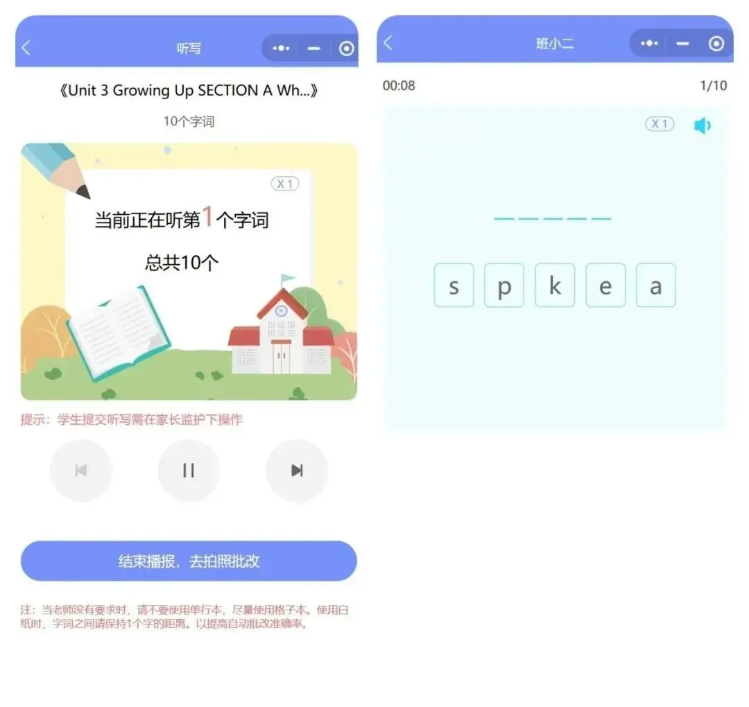 直接在班小二智慧作业布置单词听写,系统播报单词,不必担心课后听写家长发音不准、学生听不清的问题。