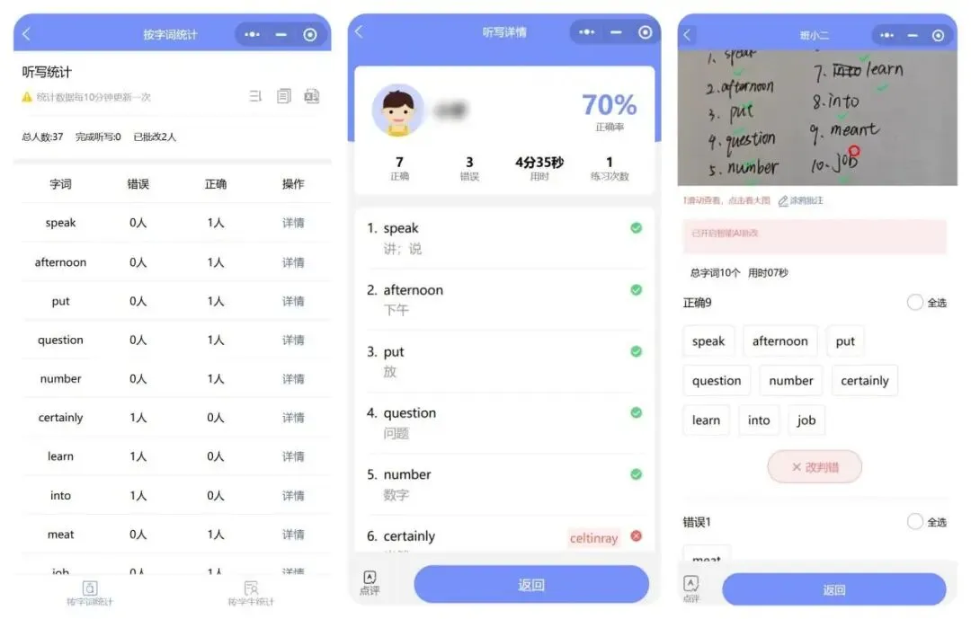 听写完成后可以直接拍照上传,或直接在线听写,AI智能批改听写情况,系统还能统计各词语错误情况,方便我及时定位学生们的易错词。