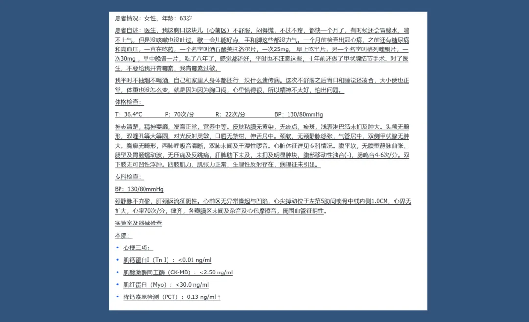 症状不典型(闷但不疼)、背景复杂(多病共存)、检查结果矛盾(心梗三项正常但PCT升高)。
