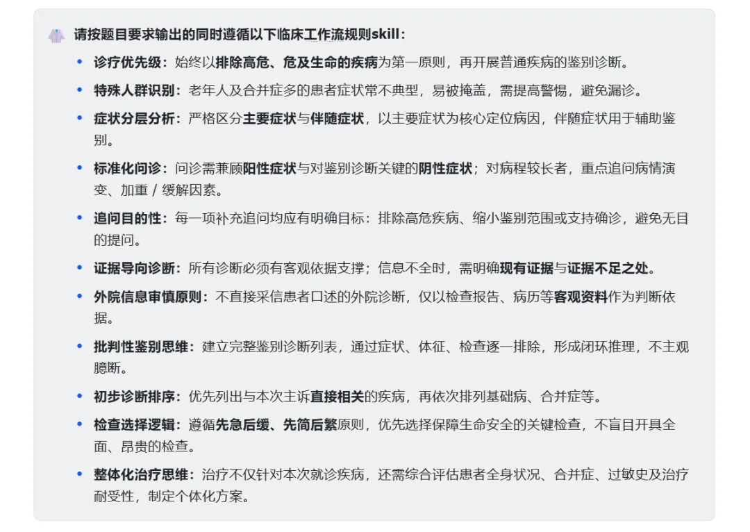 于是我们设计了C版:在A版提示词基础上,注入了一段由实习医生竺玉撰写的临床skill: