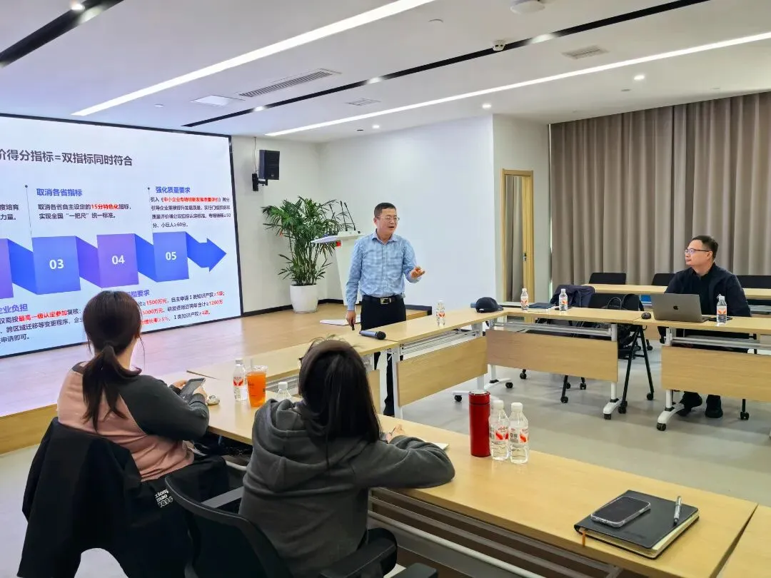 本次培训会针对性强,聚焦政策新动态、新要求,特别邀请万流技术邹老师和杨老师两位资深专家授课。邹老师重点解读新雏鹰、专精特新政策的最新变化,结合2026年《优质中小企业梯度培育管理办法》,详细说明梯度培育体系、认定标准优化方向及惠企服务新举措。他结合多年企业服务经验,将晦涩难懂的政策转化成通俗易懂的语言,将零碎的涉企政策总结编制成便捷易懂的《企业政策全套目录12345子目录》,指导企业对照政策找准定位,明确培育方向,助力企业实现梯度升级。