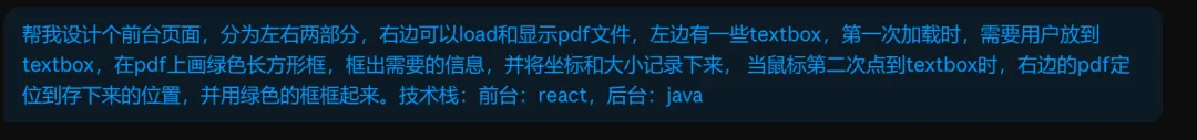 我很听劝,我买了一个月的会员试了试。我的技术栈是.net,并且很多年没写过代码了。当然对于Java,Python,React也是略懂一二,不算精通。公司要做一个项目,是关于OCR的,比对着公司的需求,我对Claude Code进行了一顿疯狂的输出,告诉他前台用React,后台用Java。 我的提示词是这样写的: