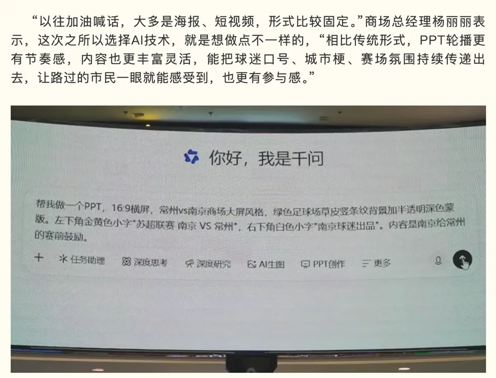 根据南京新闻的报道,原来是商场运营人员把活交给了AI。该商场总经理说,他们是用千问批量生成了100份PPT。