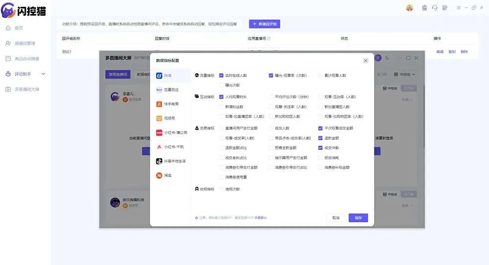 第二个区别,在于流程能否“标准化复制”。个人直播,你的话术、互动节奏全在你自己脑子里,临场发挥没问题。但团队直播,尤其是矩阵直播或者多店直播,最怕的就是“人走茶凉”或者“一人一个样”。今天A主播的直播间互动火热,明天B主播接手,数据立马下滑,为什么?因为成功的运营动作无法沉淀和复制。团队需要的工具,必须能把这些有效的动作——比如针对某个爆款商品的固定讲解顺序、针对高频问题的标准回复话术、在开播后第几分钟进行互动抽奖——变成可以一键执行的“规则”。闪控猫可以让你设置好商品循环弹窗的间隔和顺序,可以创建多组发评规则和上百条关键词自动回评。这意味着,无论哪个主播上岗,只要启动这套规则,就能保证直播流程和互动质量的下限,把个人经验转化为团队资产。