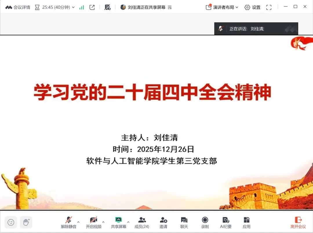 2025年12月26日,软件与人工智能学院学生第三党支部以“学习宣传贯彻党的二十届四中全会精神”为主题召开组织生活会。会议由刘佳清同志主持,党支部书记余远远老师以及全体学生党员共同参与。