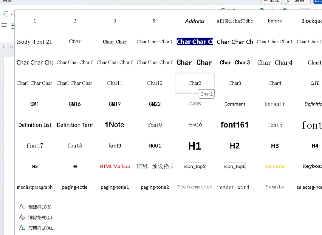 可以看到,大量的自定义(其实没几个是有用的)将常用的内置样式已经完全淹没。后续编辑者想在样式列表中找个内置样式,那是相当痛苦的事情。遇到这种情况,想辨别哪个样式有用哪个样式无用的时间成本非常高。不如痛快一点,一次将非内置样式全部清除。