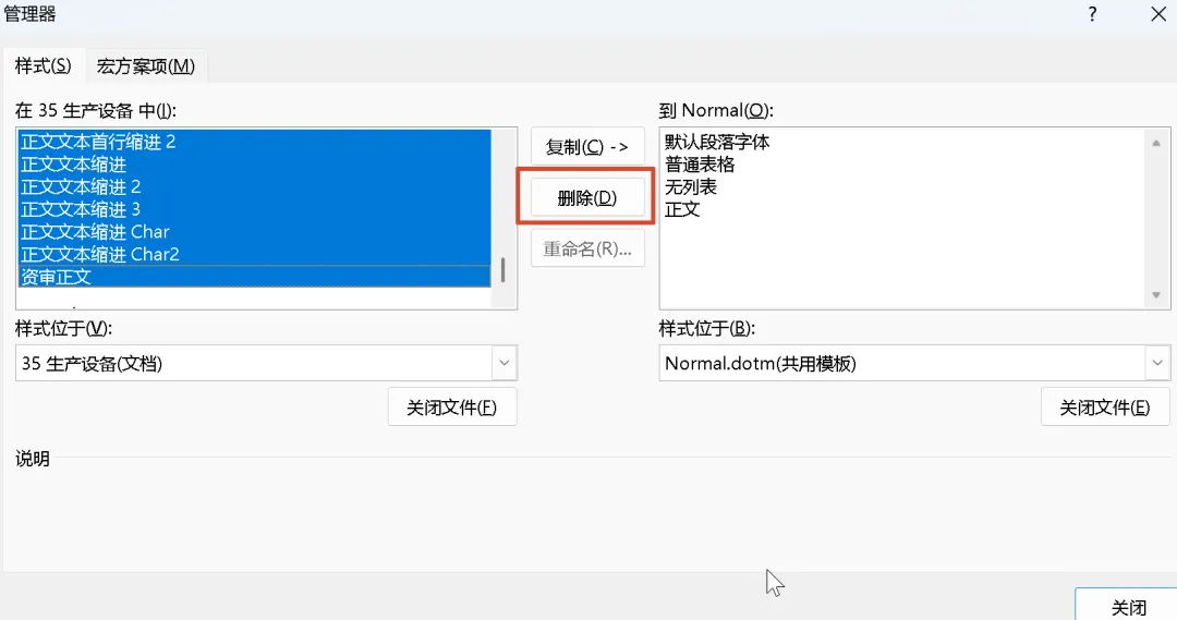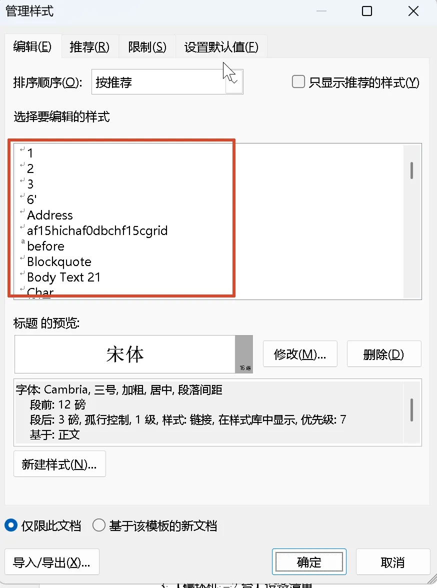 在此界面,可以看到有非常多的莫名其妙的样式。选中某一个样式,点击右侧的“删除”是可以将其删除的。但逐条删除实在是太慢了。