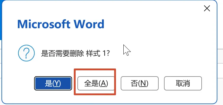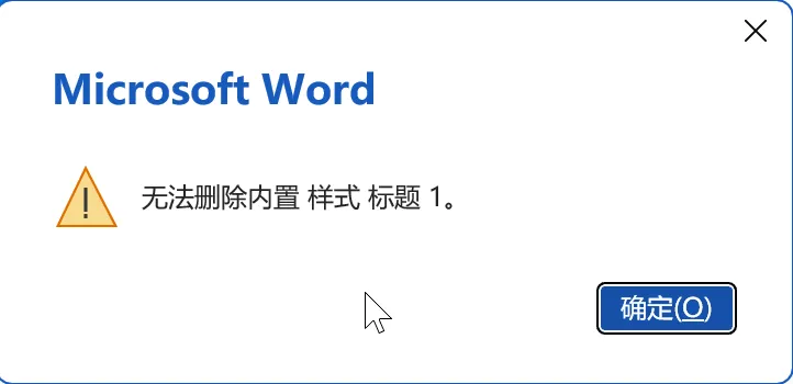 此时,word就开始删除所有的样式。但由于刚才是全选了样式,所以是包含内置样式的。而内置样式无法被删除,因此就会弹窗提示。这个没什么影响,确认即可。因为有多个内置样式,所以需要确认多次。直到所有确认完毕后,非内置样式全部被清除。