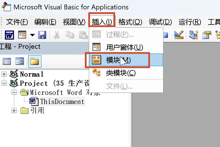 在word界面按ALT+F11,进入VBA编辑窗口。点击菜单“插入”,选择“模块”