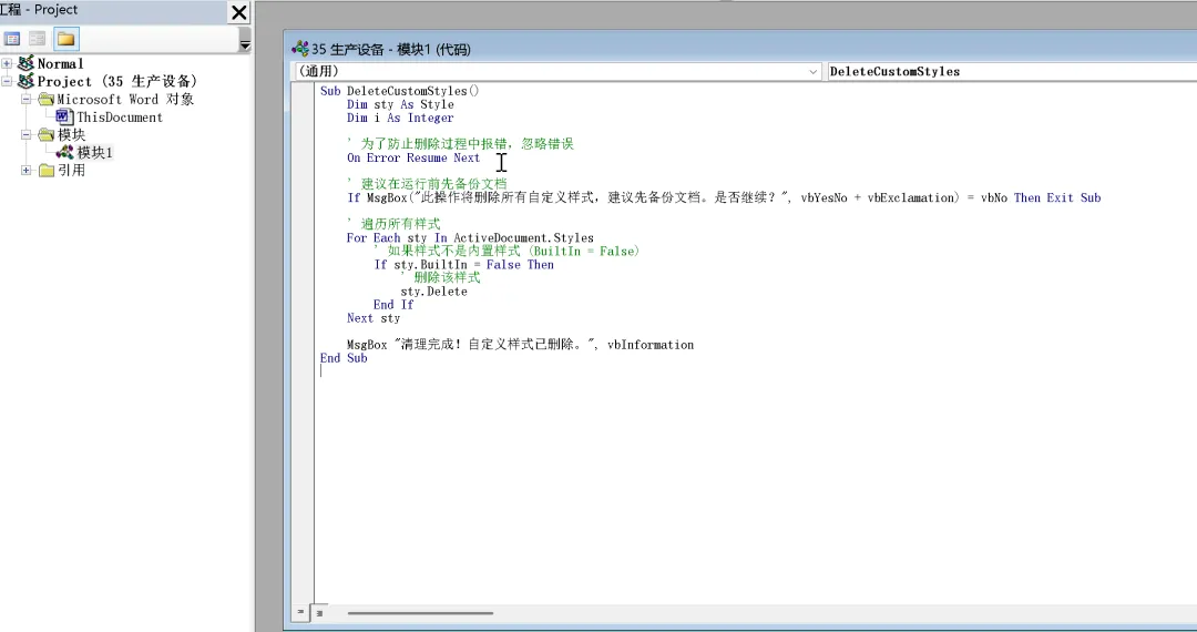 Sub DeleteCustomStyles() Dim sty As Style Dim i As Integer ' 为了防止删除过程中报错,忽略错误 On Error Resume Next ' 建议在运行前先备份文档 If MsgBox("此操作将删除所有自定义样式,建议先备份文档。是否继续?", vbYesNo + vbExclamation) = vbNo Then Exit Sub ' 遍历所有样式 For Each sty In ActiveDocument.Styles ' 如果样式不是内置样式 (BuiltIn = False) If sty.BuiltIn = False Then ' 删除该样式 sty.Delete End If Next sty MsgBox "清理完成!自定义样式已删除。", vbInformationEnd Sub