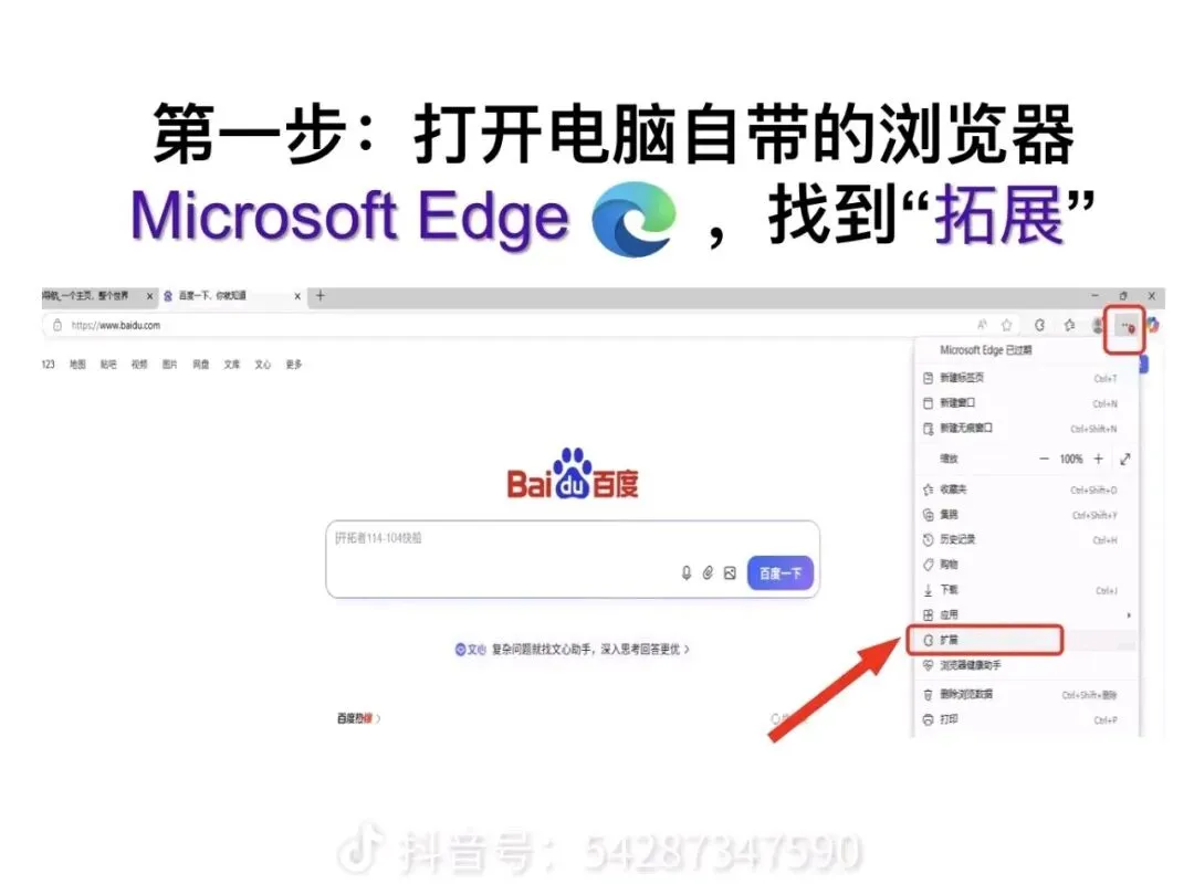 2. 点击浏览器右上角的「三个点」按钮,在弹出的菜单里找到「扩展」选项,点击进入扩展管理页面。