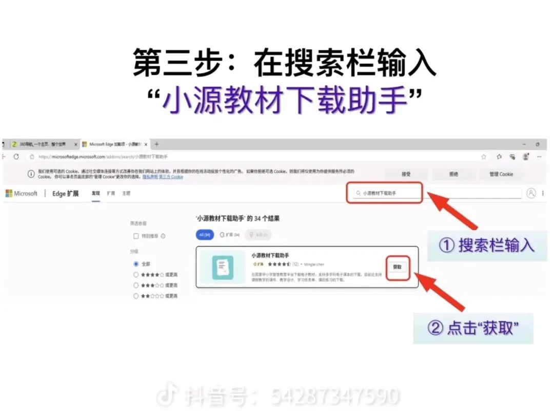 4. 在扩展商店的搜索栏里,输入 “小源教材下载助手”,找到对应的工具后,点击「获取」按钮,等待安装完成。