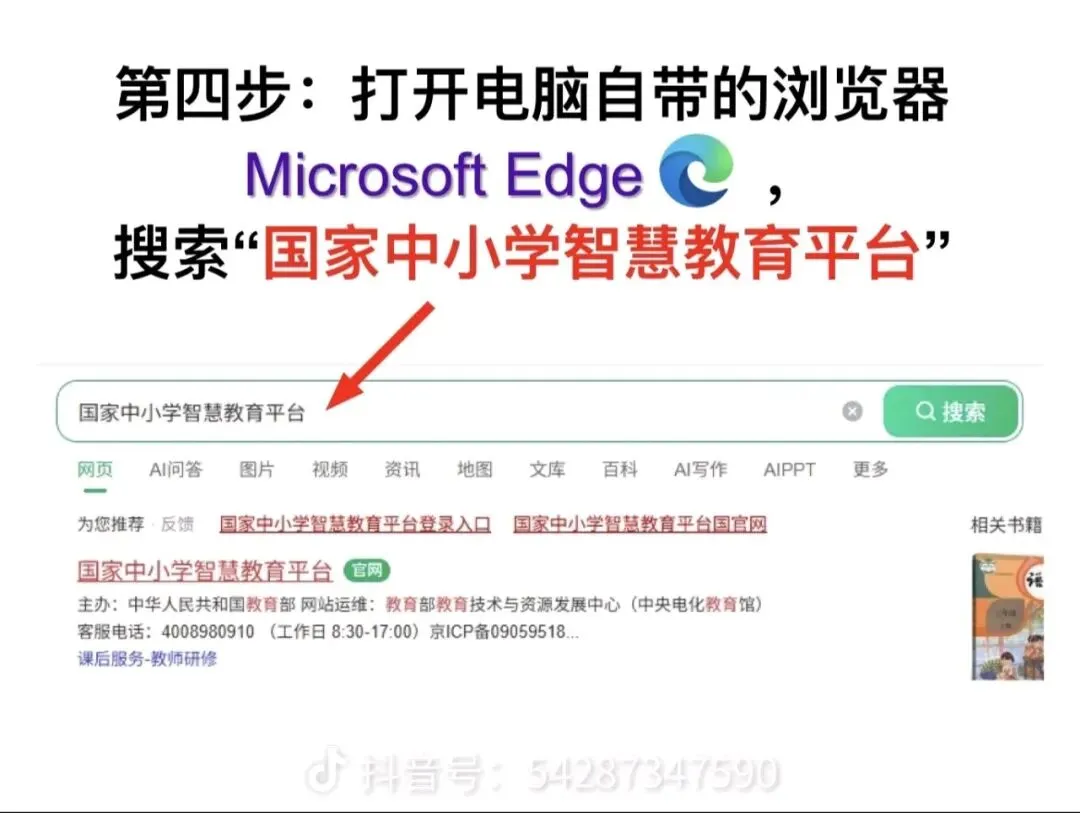 1. 还是在Edge浏览器里,搜索 “国家中小学智慧教育平台”,点击带有「官网」标识的链接进入平台首页。