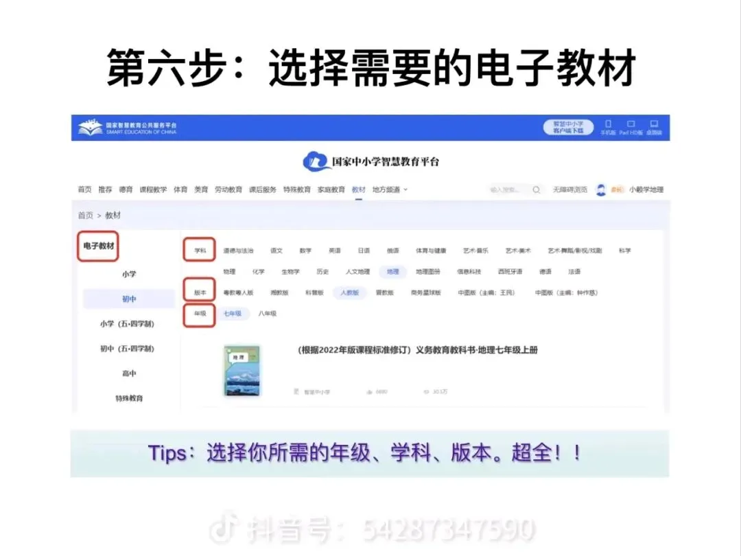 3. 在页面左侧,先选择学段(小学/初中/高中),再根据需要筛选学科、教材版本、年级。比如你要找七年级人教版地理,就依次选「初中-地理-人教版-七年级」。