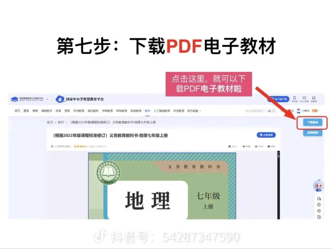 2. 点击「下载教材」,等待几秒钟,PDF格式的电子教材就会自动保存到你的电脑里啦!