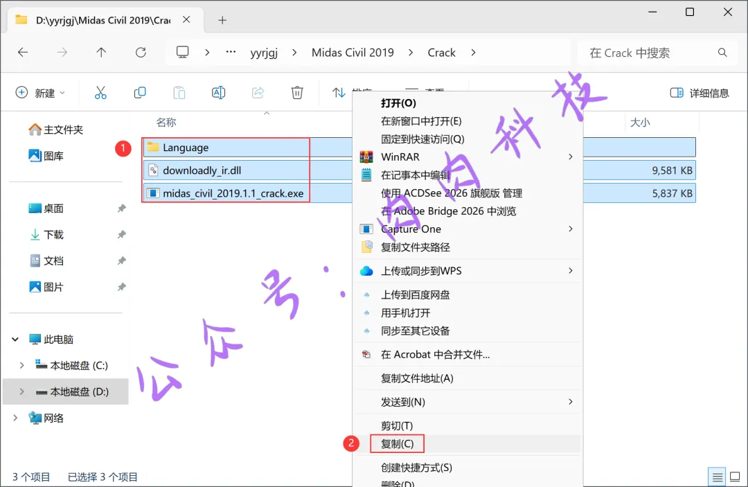 1.将Midas Civil 2019软件安装包下载到电脑上,我是下载到D盘的一个英文文件夹内。右键Midas Civil 2019安装包,点击【解压到当前文件夹】