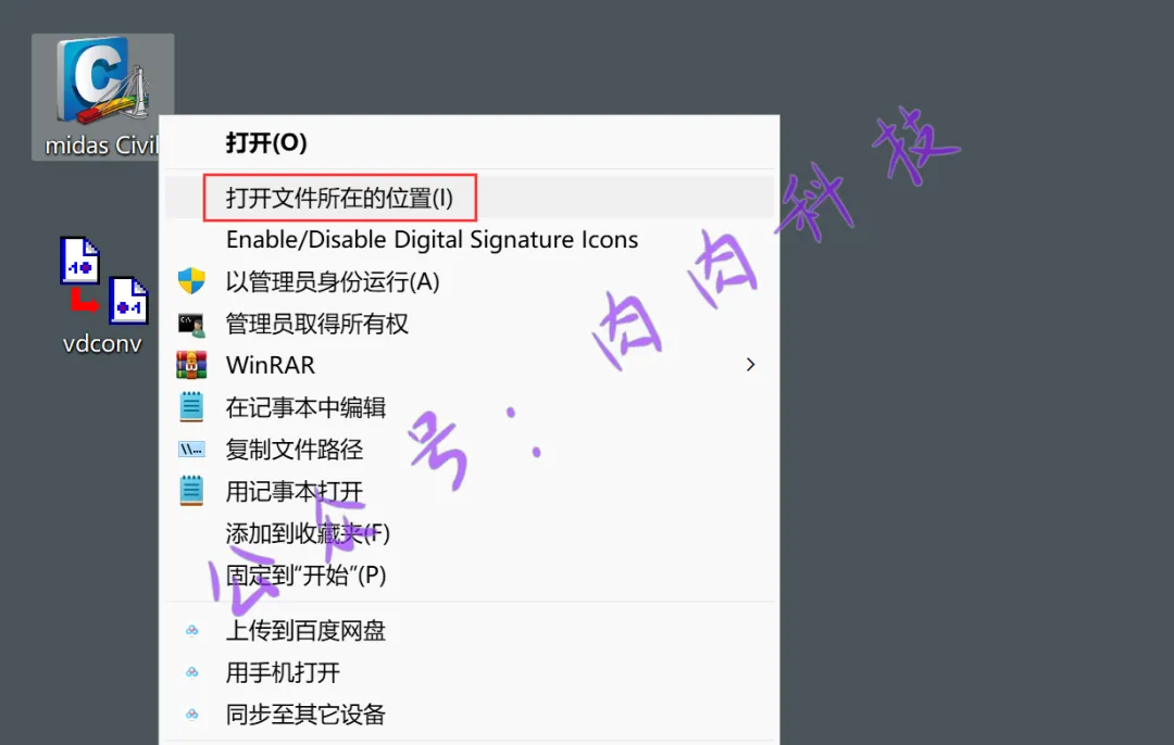 33.回到电脑桌面上,右键【Midas Civil软件快捷方式】,点击【打开文件所在位置】