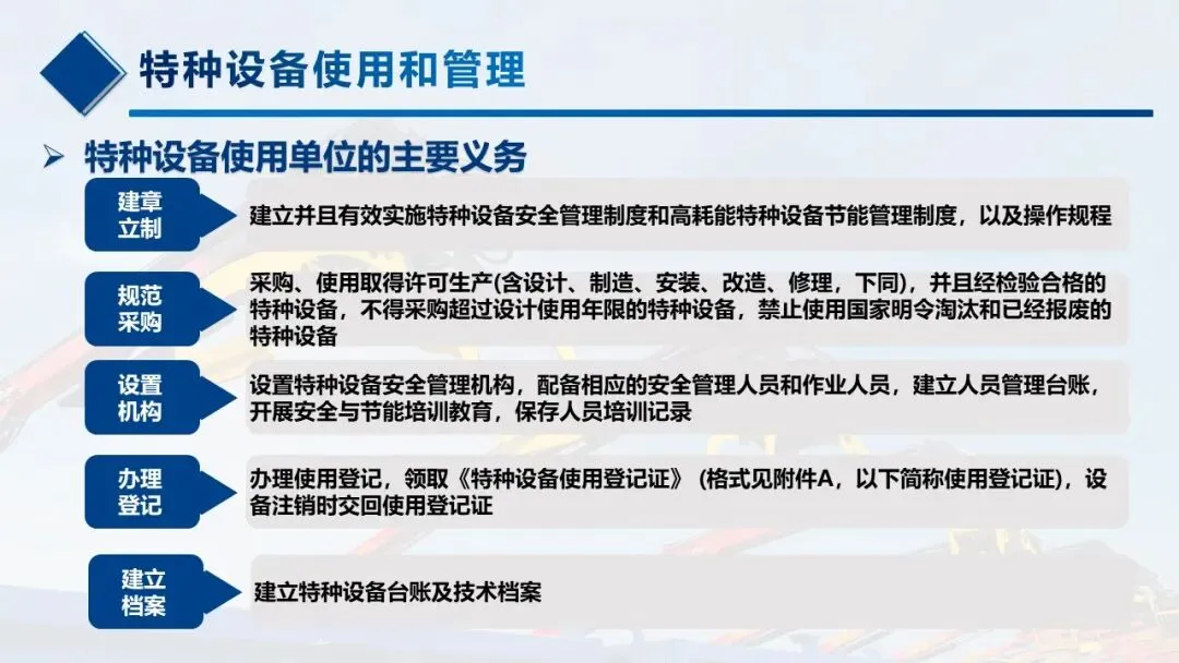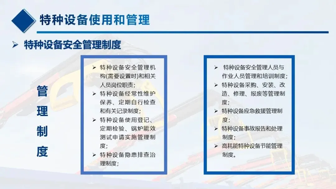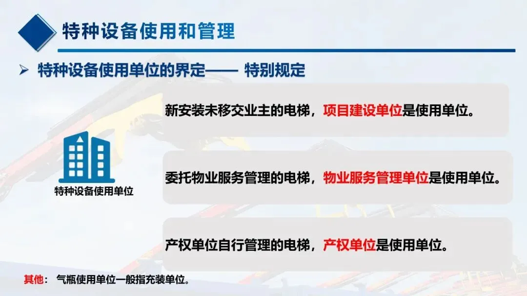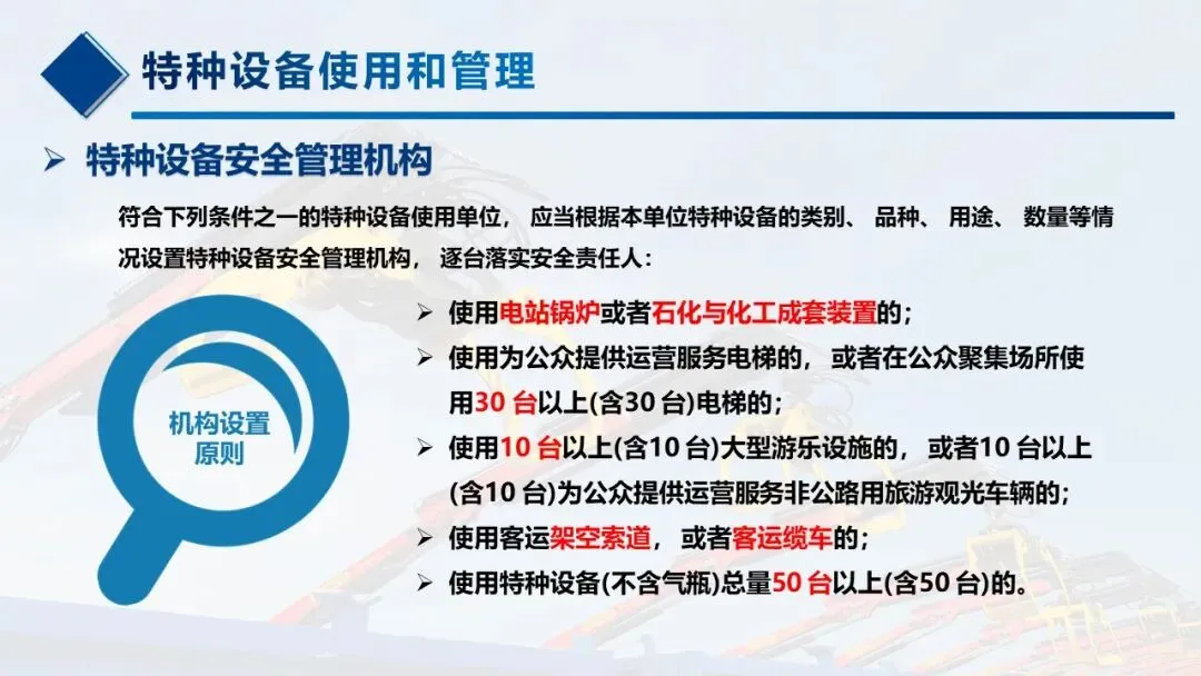 只要在《特种设备目录》里的设备,使用安全和节能管理都要按新规来,包括锅炉、压力容器(含气瓶)、压力管道、电梯、起重机械、客运索道、大型游乐设施、场(厂)内专用机动车辆,这些是咱们日常管理的核心。 -