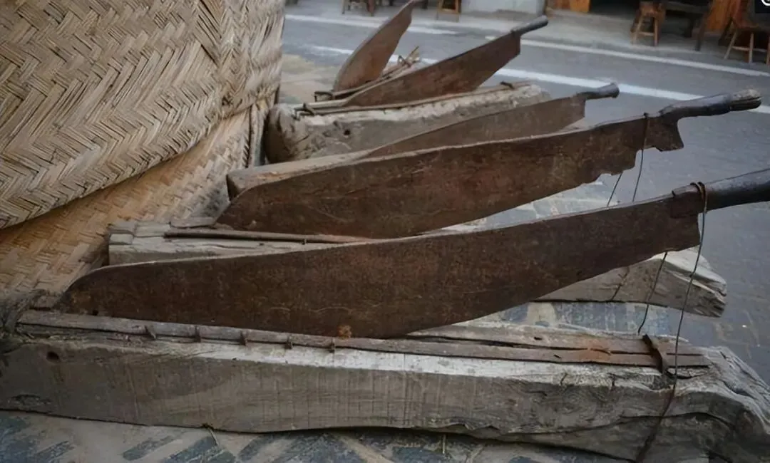 几把大刀并排躺在木头上,刀刃上满是锈迹,看着就沉,那是庄稼人手里最硬气的家伙事儿,