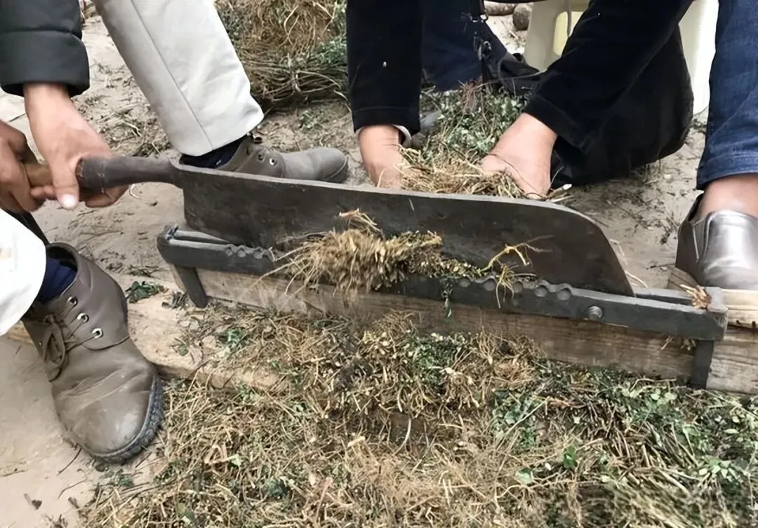 一个人按着草,一个人压着刀,咔嚓咔嚓一阵响,草料就变成了碎末,那是喂饱牲口的关键一步,