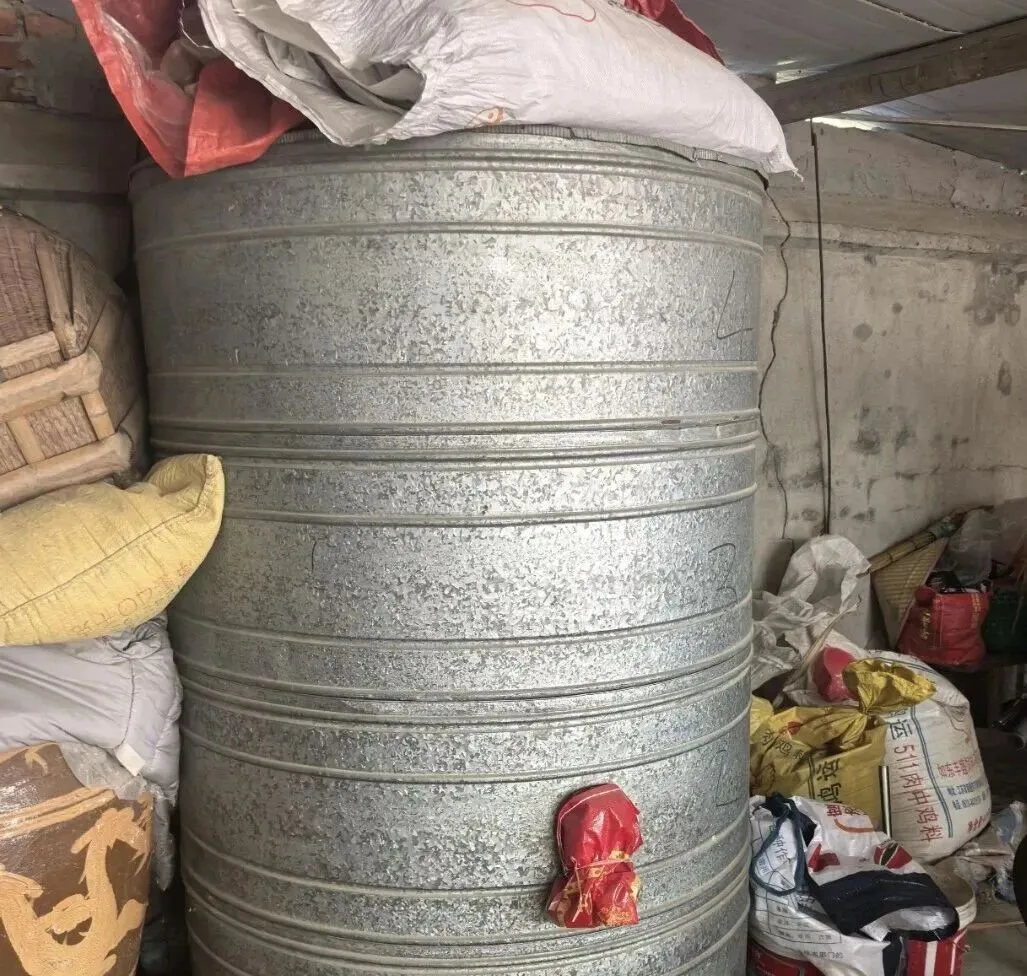 第二样家伙摆在杂物间或者粮仓的角落,叫镀锌板储粮桶,你家有没有记得这种高高的铁皮桶,外头一圈圈的压痕,敲一下咚咚响,肚量大得像能装一整年的心事,秋收忙完,粮食一袋一袋往里倒,红布包着出口那是防老鼠防湿气的,小细节都透着用心