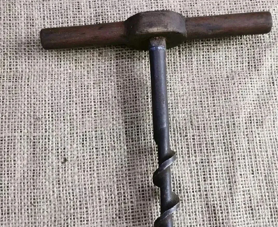 你瞅这铁家伙像不像拧瓶盖的,其实正经名叫手工木工钻孔工具,也有叫手绞钻的,老木匠用来打孔的,中间一根钢钻头,横着一根斜着的木柄,双手一拧,钻尖就慢吞吞往木头里咬下去