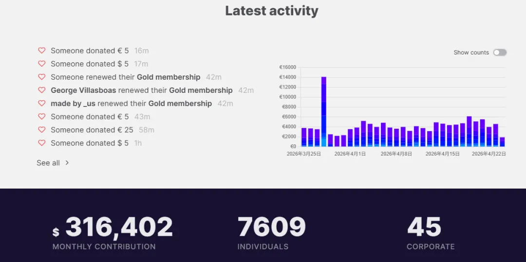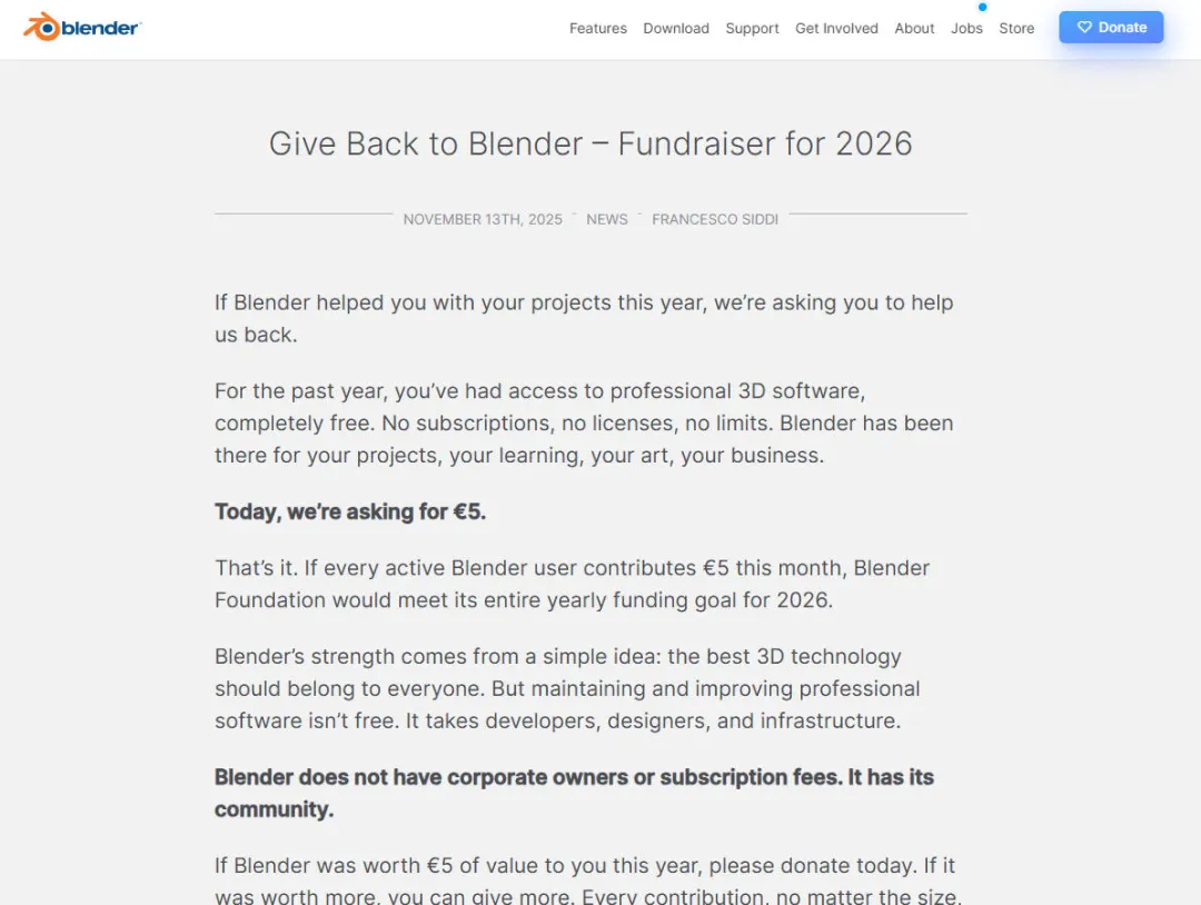 按理说,这样的用户量应该不缺钱,但由于是开源工具,Blender几乎每年都要在官网上演一出苦情戏:请求捐赠,解释资金紧张,呼吁大家掏钱。比如2024年,Blender发起了2%捐赠活动(只要有2%用户捐赠即可保持30人团队运营),2025年发起了5欧元捐赠活动(每用户5欧元足够公司活过2026年)。