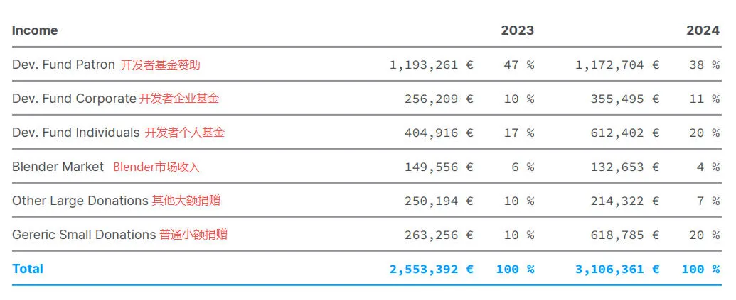 从Blender公布的2024年报来看,该公司收入有一半来自开发者和企业基金(50%),其余来自开发者个人、市场收入以及大额和小额捐赠。