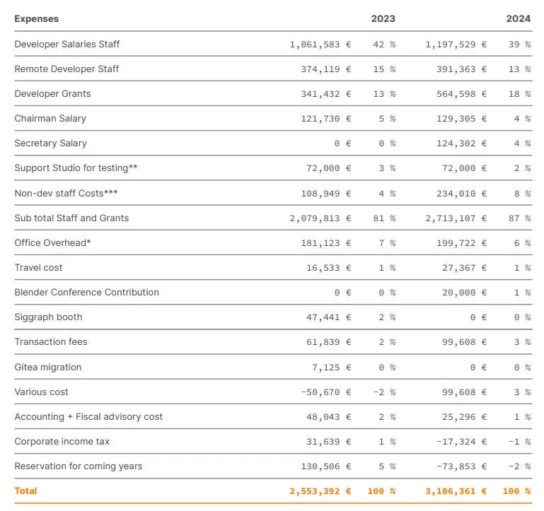 从年报来看,Blender将55%的支出用在了人员身上:全职团队、远程开发者、测试人员、办公室租金、会议、税费。这笔账算下来,董事长Ton的年薪是12.9万欧元,在欧美资深开发者里算是中等收入,可以说丝毫没有浪费。虽然收入比2023年增长了20%,但它依然亏损。