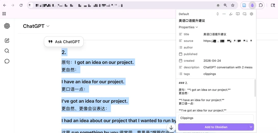 比如,我在和 ChatGPT 对话时,如果只想保存其中一段关键回答,就可以先选中这部分内容,然后点击 Obsidian Web Clipper。这样保存下来的就不是整页内容,而是我真正想留下的那一部分。