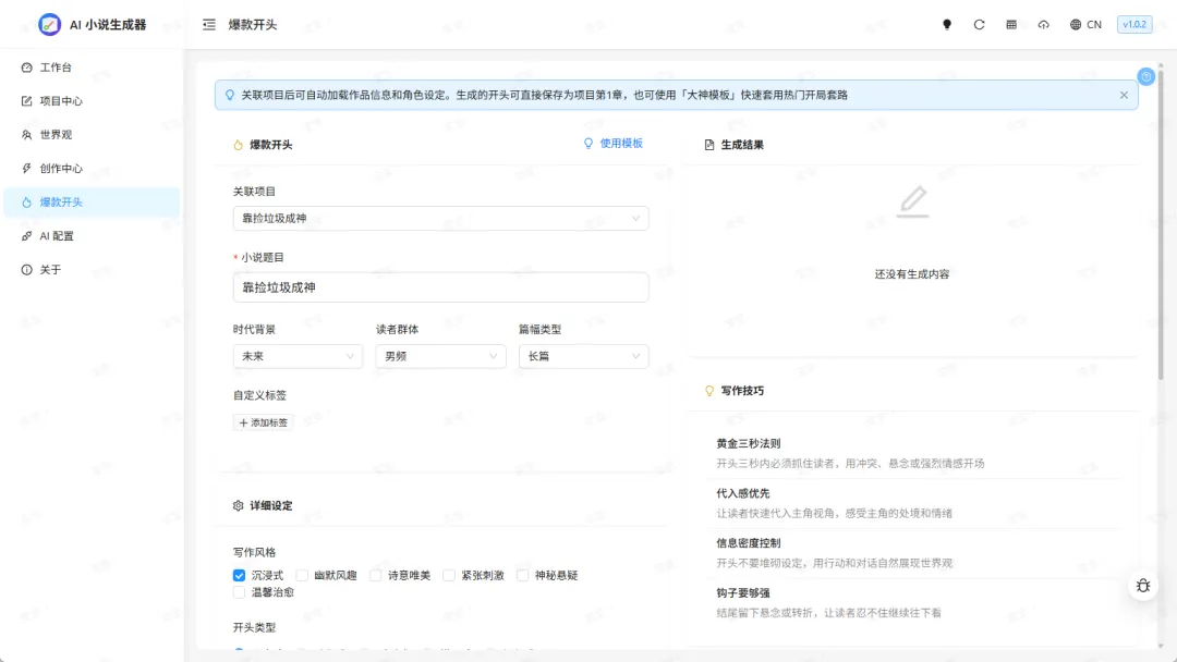情节智能规划:支持三幕式、英雄之旅等主流故事结构,能生成详细的章节目录和剧情走向,让长篇框架更清晰。