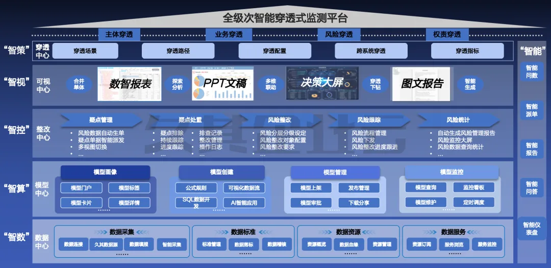 构建智能穿透式监管体系,核心是锚定国资委“全级次、全流程、全要素”监管要求。围绕这一体系建设思路,史瑞超重点介绍了数智赋能的穿透式监管方案,展示了“主体穿透、业务穿透、风险穿透、权责穿透”的全级次智能穿透式监管平台。
