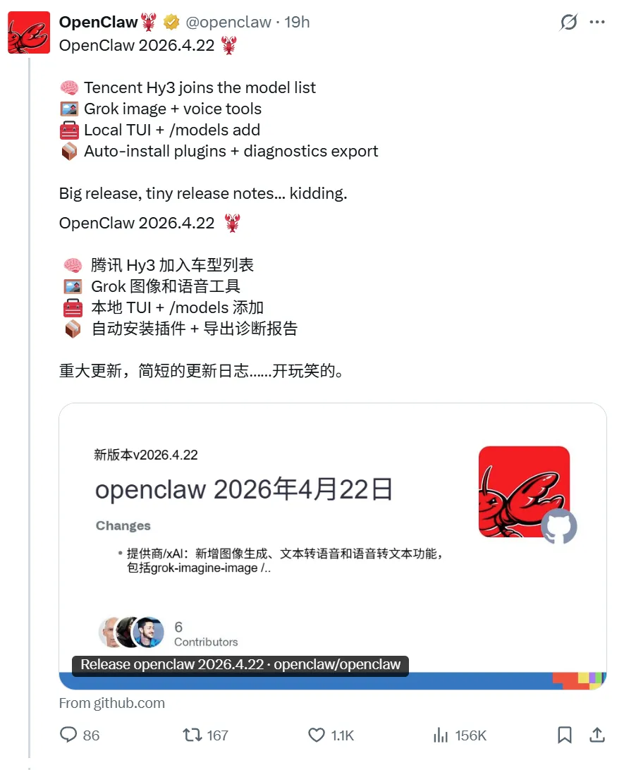 OpenClaw 4.22 这次更新,真正值钱的不是腾讯 Hy3,也不是 Grok 画图