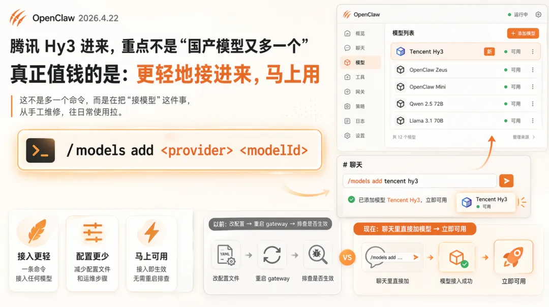 以前很多人接新模型,卡的不是模型本身,是那套很烦的流程:改配置、重启 gateway、再看生没生效,不行继续排。