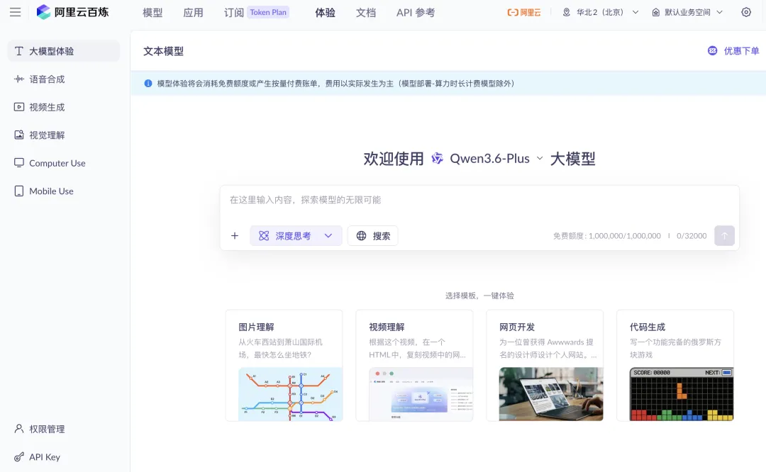 你可以在下面这个阿里云百炼的网页上注册一下,用支付宝扫码认证,然后系统就会给你自动赠送100万token额度: