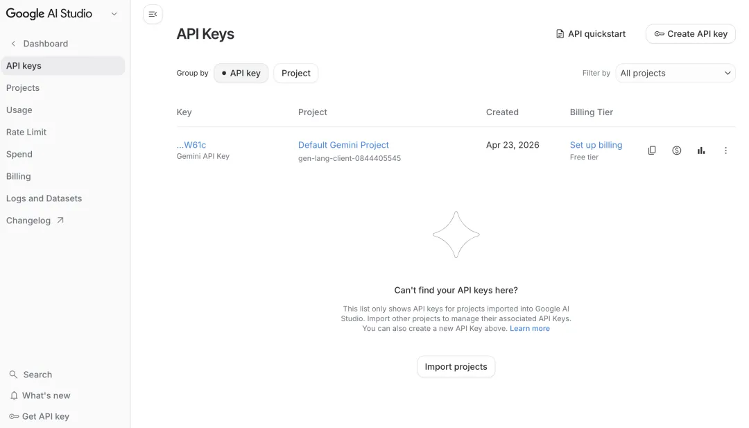 也是一样的手续,在右上角点击【Create API key】,再点【Create key】即可。这个是以AI开头的一长串。