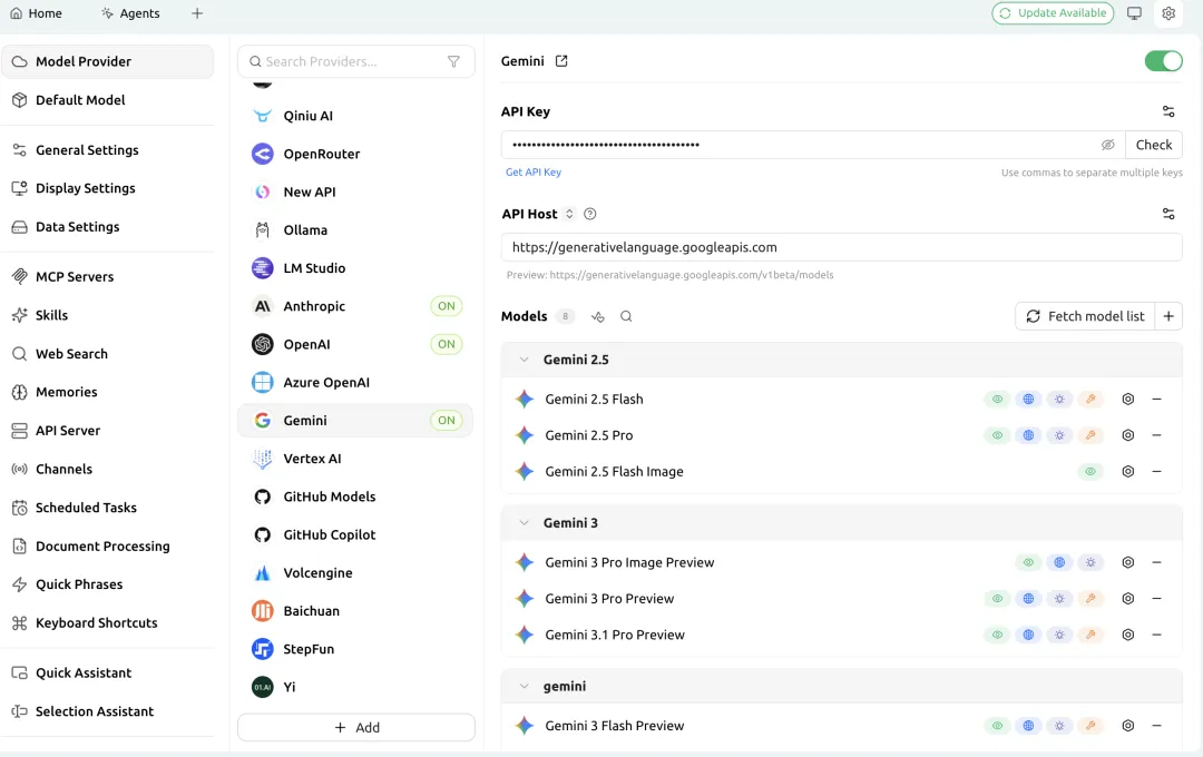 打开软件后,界面如图所示,首先要选择一个自己拿到API的模型,比如我这里选择的就是Gemini,然后在右上【API Key】处输入那一长串字母和数字。