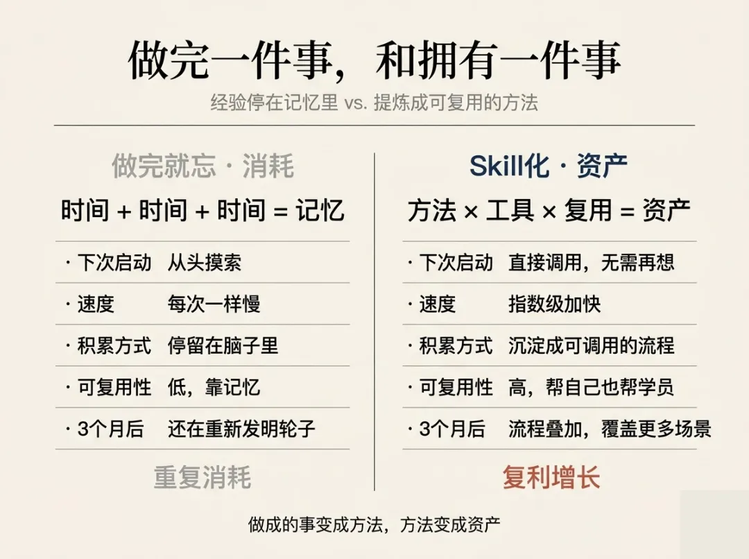 我攒下来的是「把做成的事变成可以复用的方法」这个能力。这个能力跟工具无关。工具换了,skill接着用;模型升级了,skill接着用。别人换工具是重新开始,我换工具是往已有的系统里加一块积木。