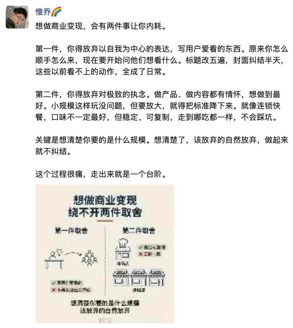 公众号的流程跑通之后,我把同样的思路用在了朋友圈。朋友圈和文章不同,读起来要有随手写下来的感觉,AI写最容易露馅。现在朋友圈也是AI出的,读者看不出来。因为流程里有专门去AI味的一步,文字过完,节奏变了,那种机械感就没了。