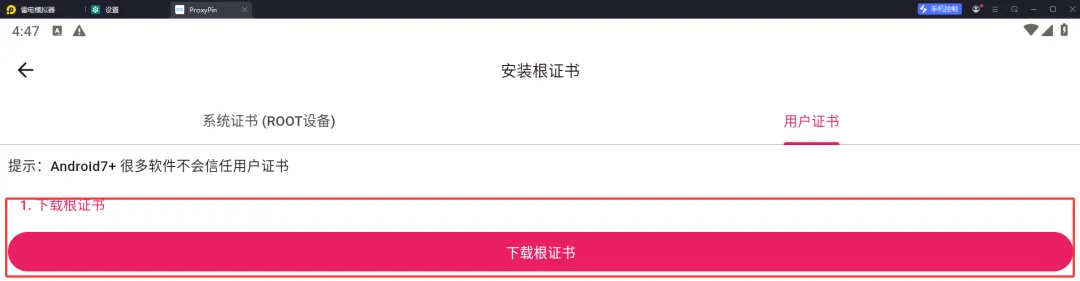 注意: 安卓系统从 Android 7.0(API 24)开始,默认不再信任用户安装的 CA 证书,导致无法直接使用用户证书进行 HTTPS 抓包。因此,还需要将用户凭证转为系统凭证。